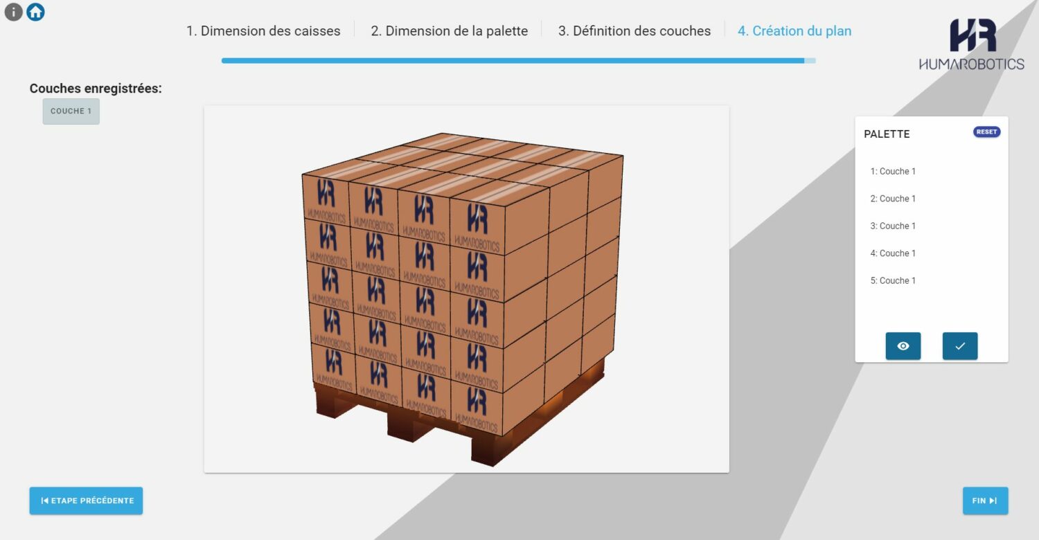 Le logiciel de palettisation HumaRobotics simplifie la création des plans de palettisation. Intuitif et rapide à prendre en main, il permet de configurer les cartons et les palettes, de définir les couches et leur orientation, puis de visualiser instantanément le résultat. En quelques clics, le programme est généré et peut être envoyé directement au robot.